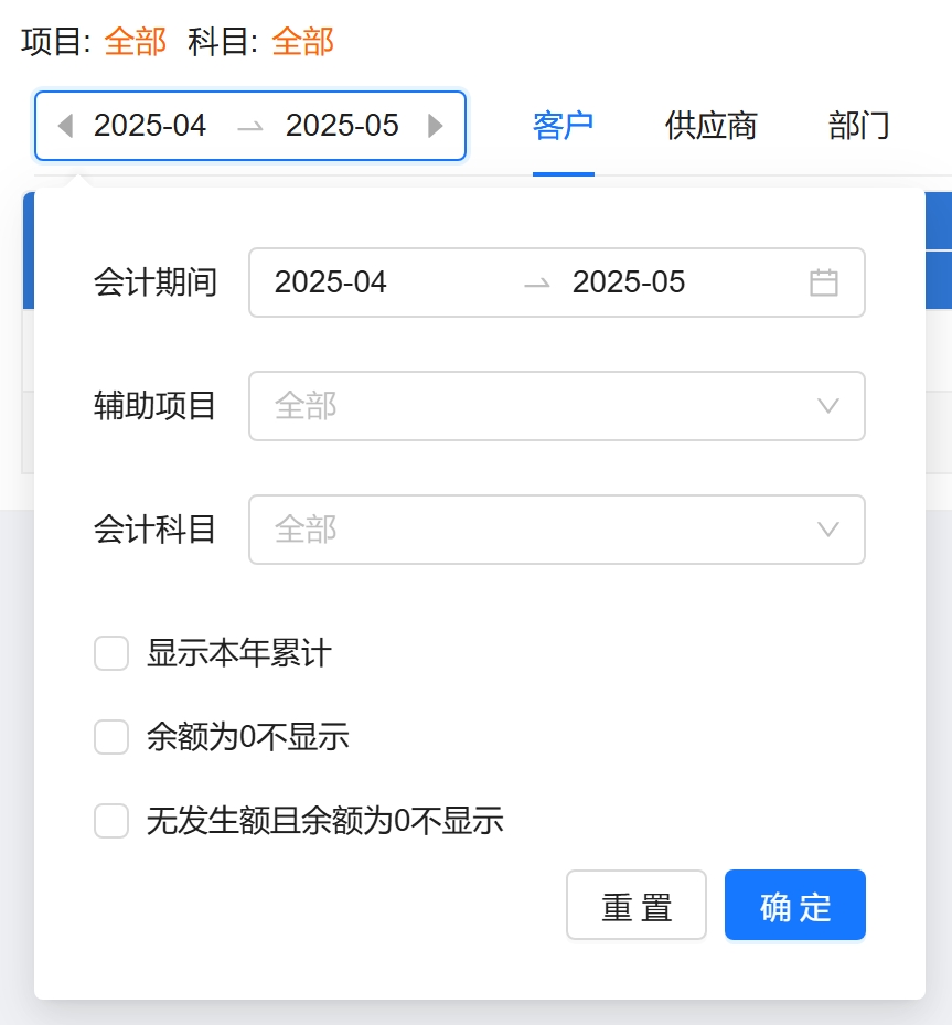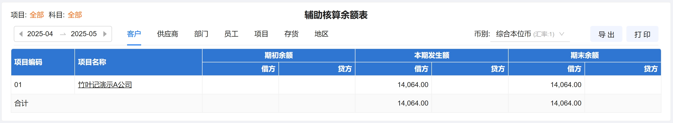 (1) 切换Tab标签,可以查询不同辅助核算类别下的余额表