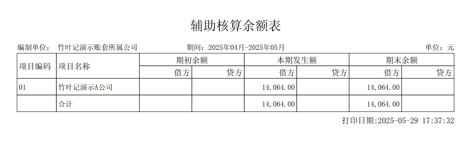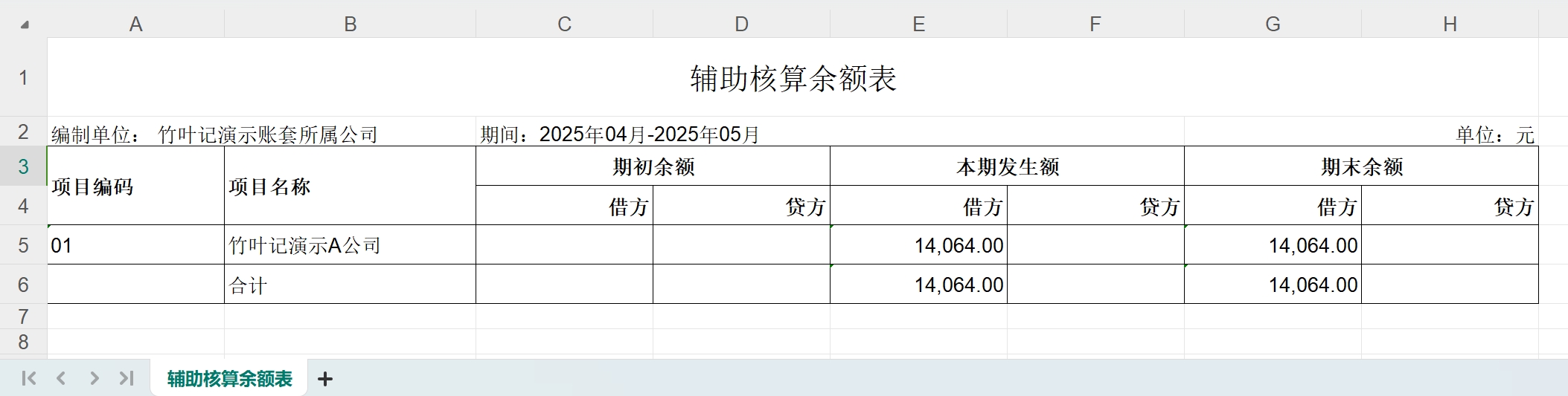点击导出按钮,可导出辅助核算余额表数据,导出效果如下: