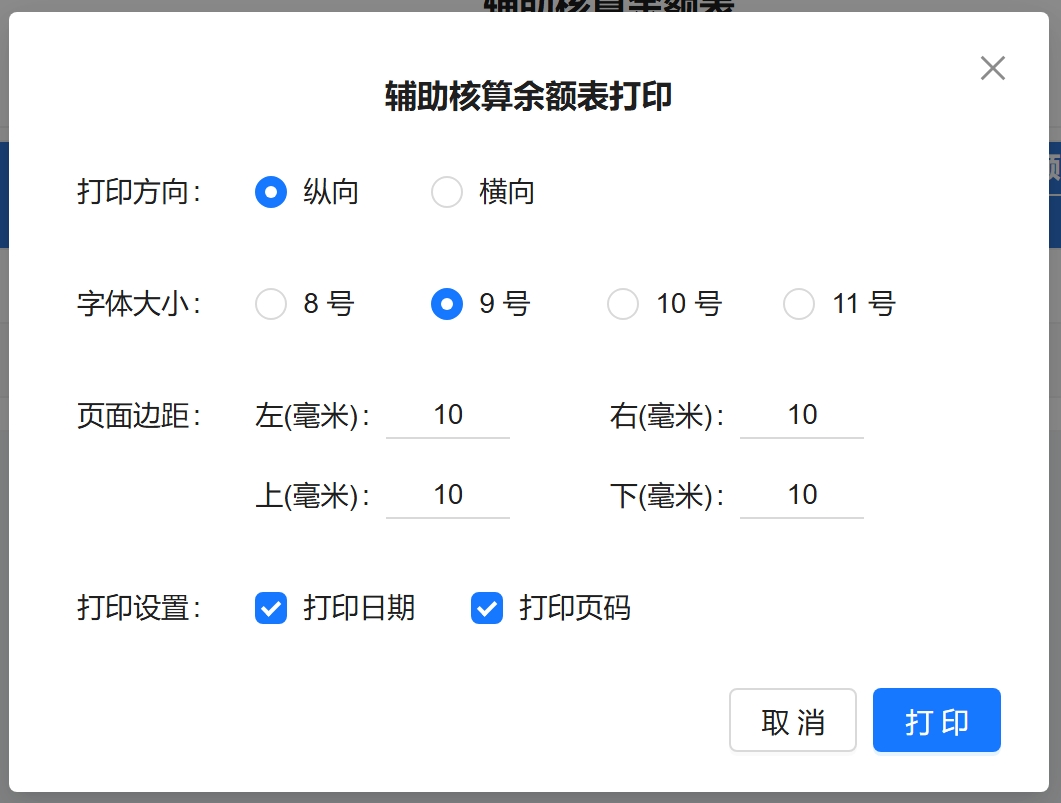 点击打印按钮,弹出打印对话框,点击打印即可打印辅助核算余额表,如下图所示: