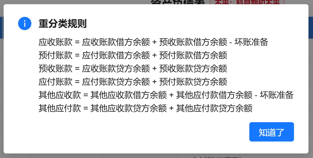 勾选开启重分类复选框,开启报表重分类,重分类可让资产负债表真实、公允地反映企业财务状况,点击?可查看重分类规则: