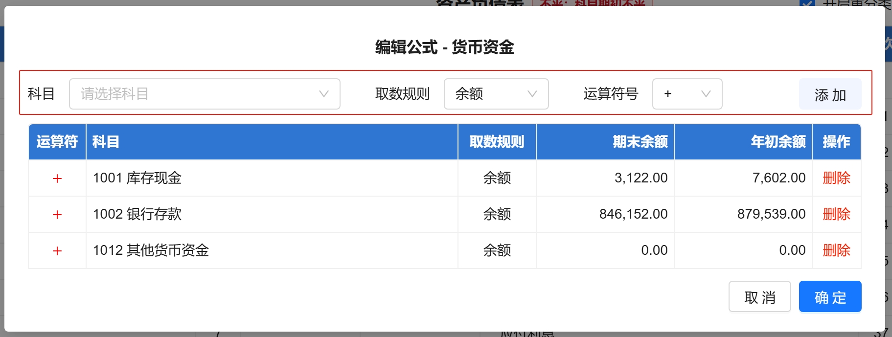 (1) 在科目下拉列表框中选择科目,在取数规则下拉列表框中选择取数规则,在运算符号下拉列表框中选择运算符号,然后点击添加按钮,即可添加公式规则