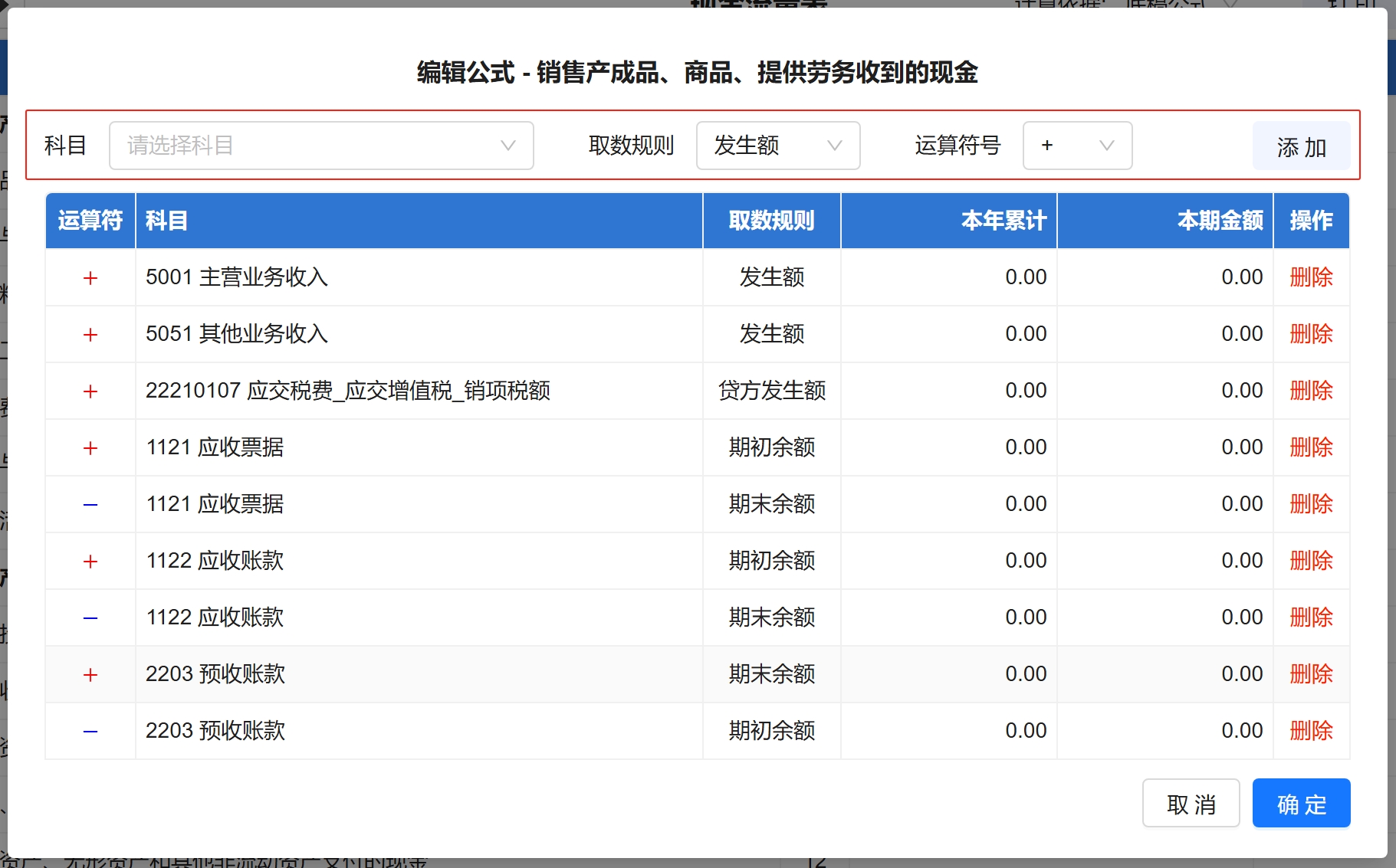 (1) 在科目下拉列表框中选择科目,在取数规则下拉列表框中选择取数规则,在运算符号下拉列表框中选择运算符号,然后点击添加按钮,即可添加公式规则