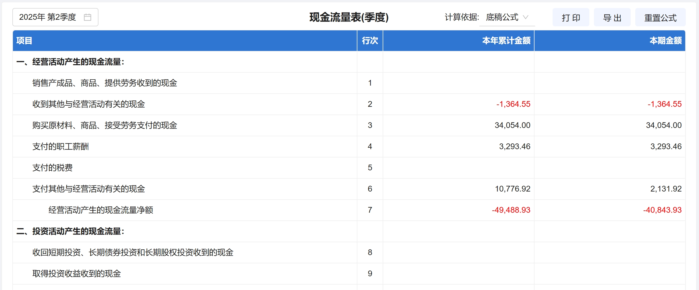 点击打印按钮,弹出打印对话框,点击打印即可打印现金流量表(季度)