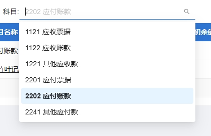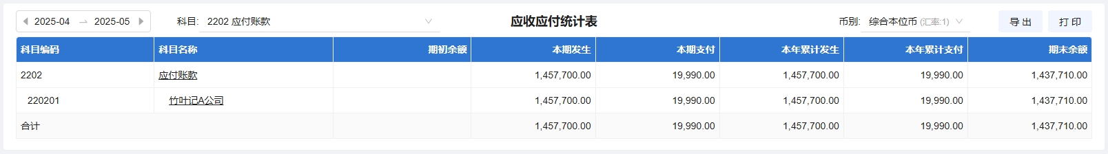 (1) 从科目下拉列表框中选择不同的科目,可以查询不同科目的应收应付统计表,如下图