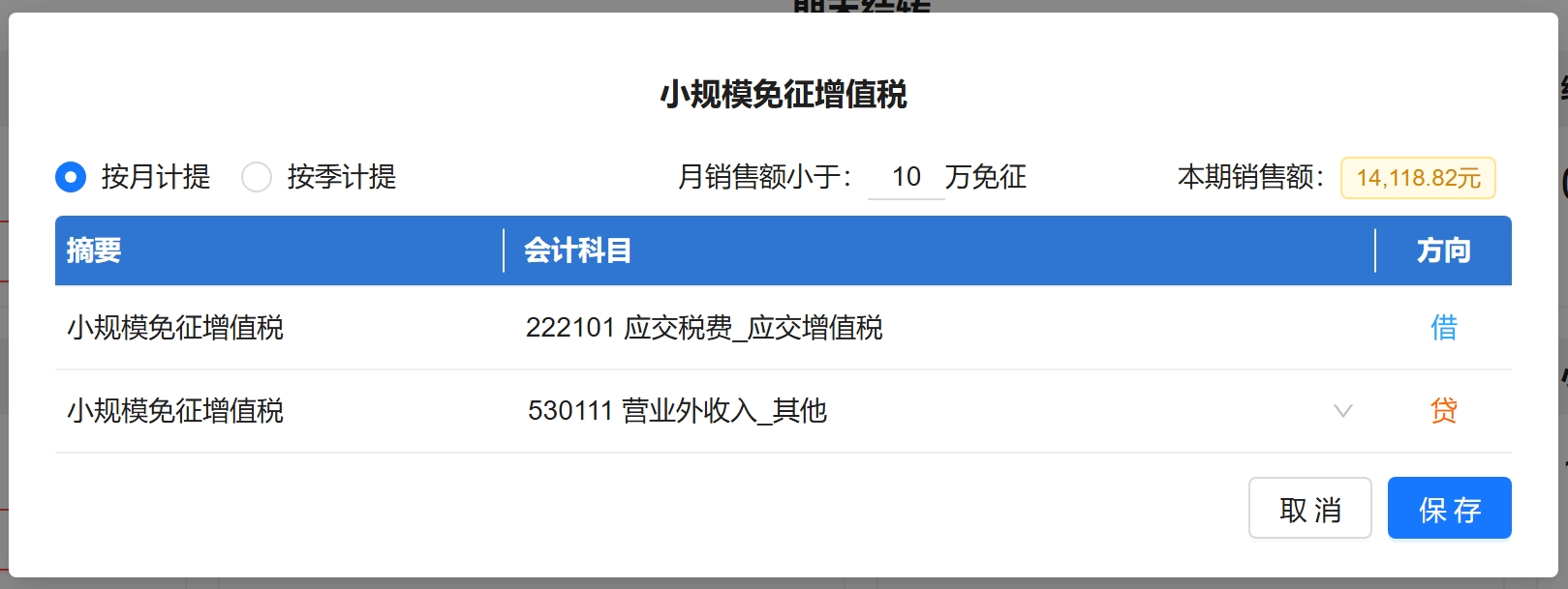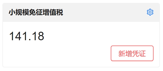 此卡片用于小规模纳税人增值税的免征处理,只有小规模纳税人才会出现此卡片,点击齿轮按钮弹出设置对话框,您可设置按月结转还是按季结转,还可以设置把免征的增值税结转到哪个科目下,默认结转至营业外收入-其他科目下,如下图: