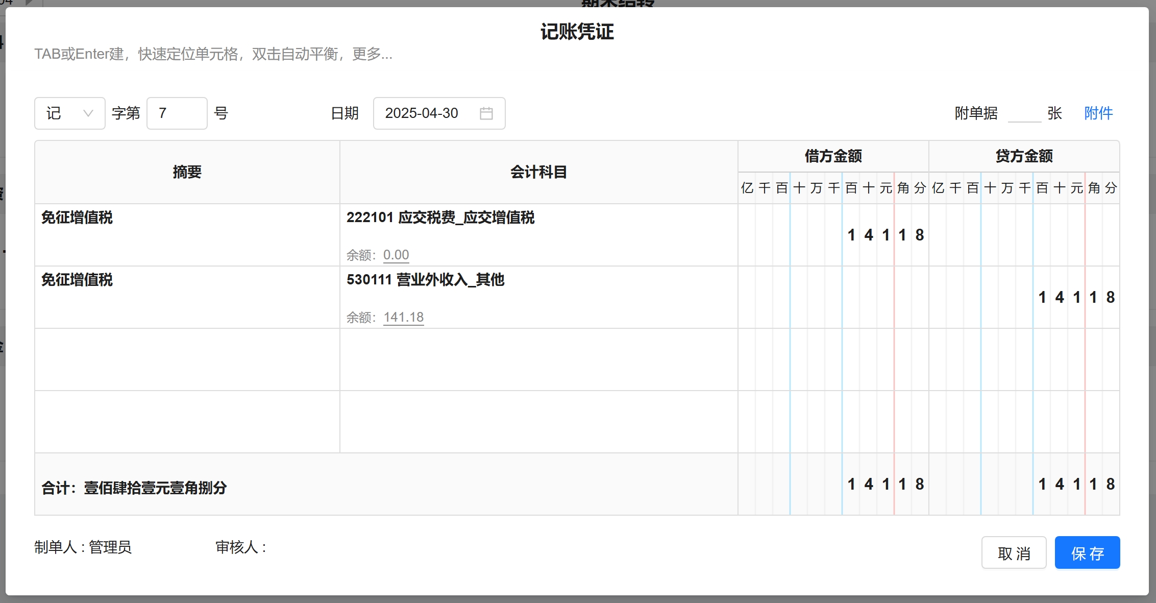 点击小规模免征增值税卡片上的新增凭证按钮,可以创建相应的记账凭证,如下图: