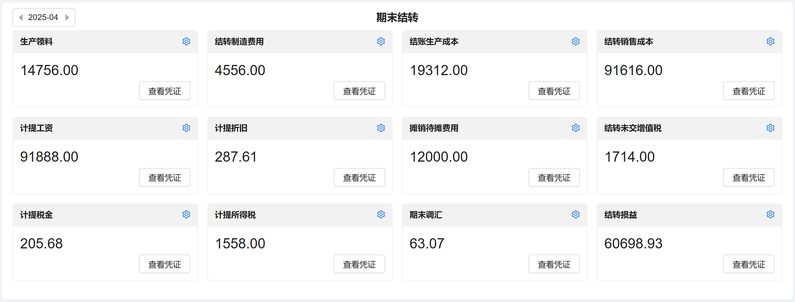 此界面用于创建各类期末会计凭证,确保期末账务处理的准确性和效率;系统内置了12张结转卡片,卡片上的金额是系统根据凭证记录或模块数据自动计算所得,点击新建凭证可以创建相应的凭证;如果凭证已创建,点击查看凭证即可查看/修改/删除凭证,如下图: