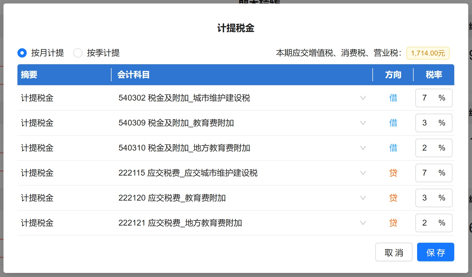 此卡片用于计提税金及附加,点击齿轮按钮弹出设置对话框,可设置凭证模板以及税率,税金及附加的计税依据是本期应交增值税、消费税、营业税,如下图: