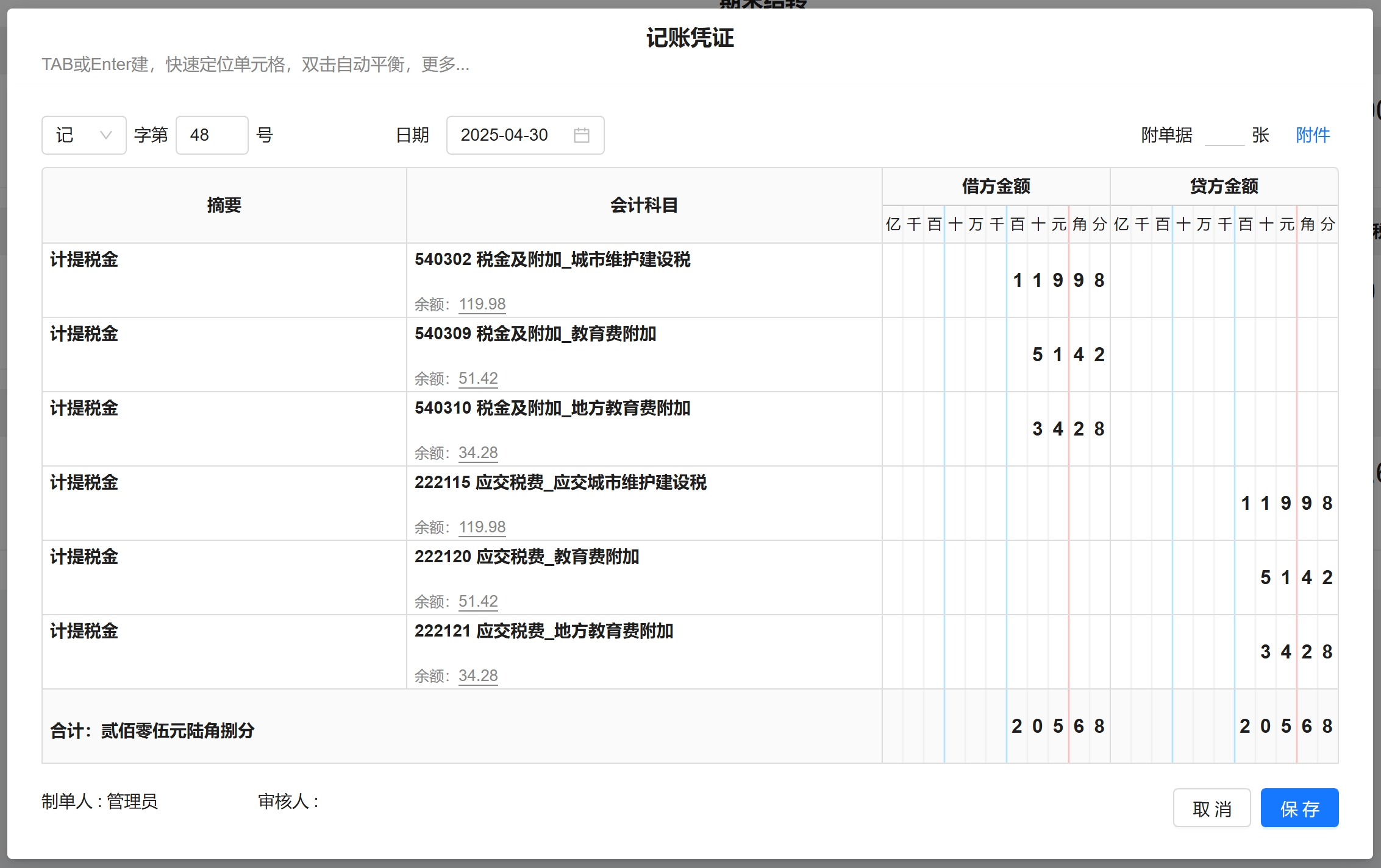 点击计提税金卡片上的新增凭证按钮,可以创建相应的记账凭证,如下图: