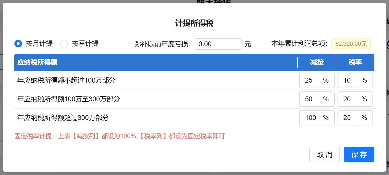 此卡片用于计提企业所得税,点击齿轮按钮弹出设置对话框,可设置以前年度亏损、以及优惠比例和缴纳税率,如下图: