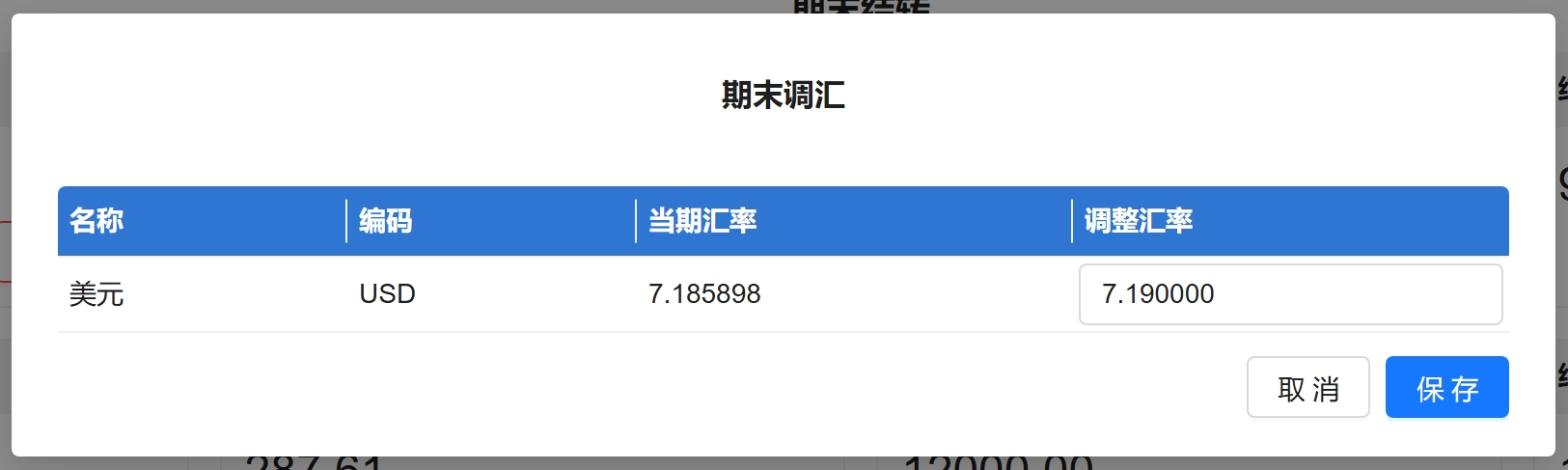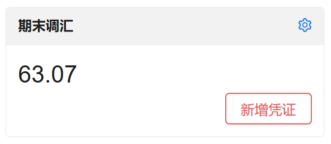 此卡片用于调整外币账户的汇率差异,点击齿轮按钮弹出设置对话框,其中当前汇率是指当期凭证录入时的汇率,调整汇率是指期末汇率,修改这个值可以调整期末汇率,如下图: