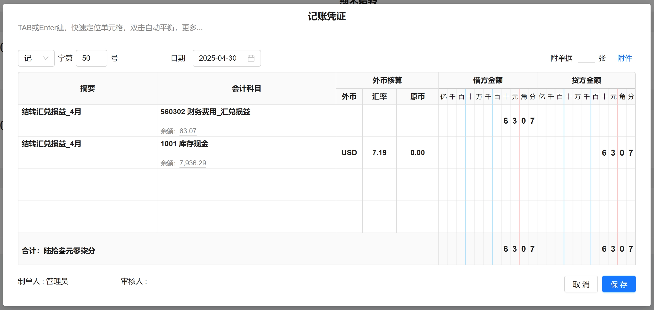 如果调整了期末汇率,系统自动计算汇兑损益金额,点击期末调汇卡片上的新增凭证按钮,可以创建相应记账凭证,如下图: