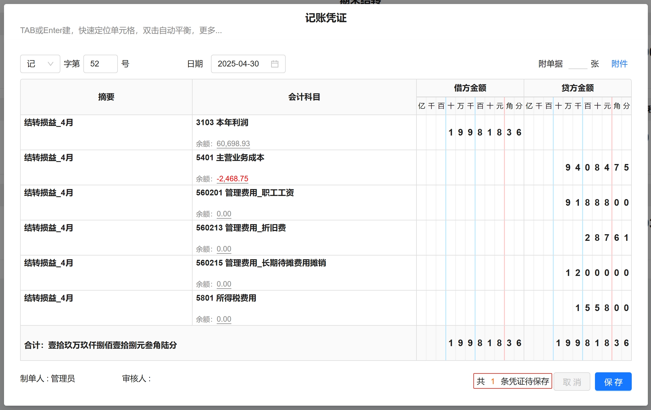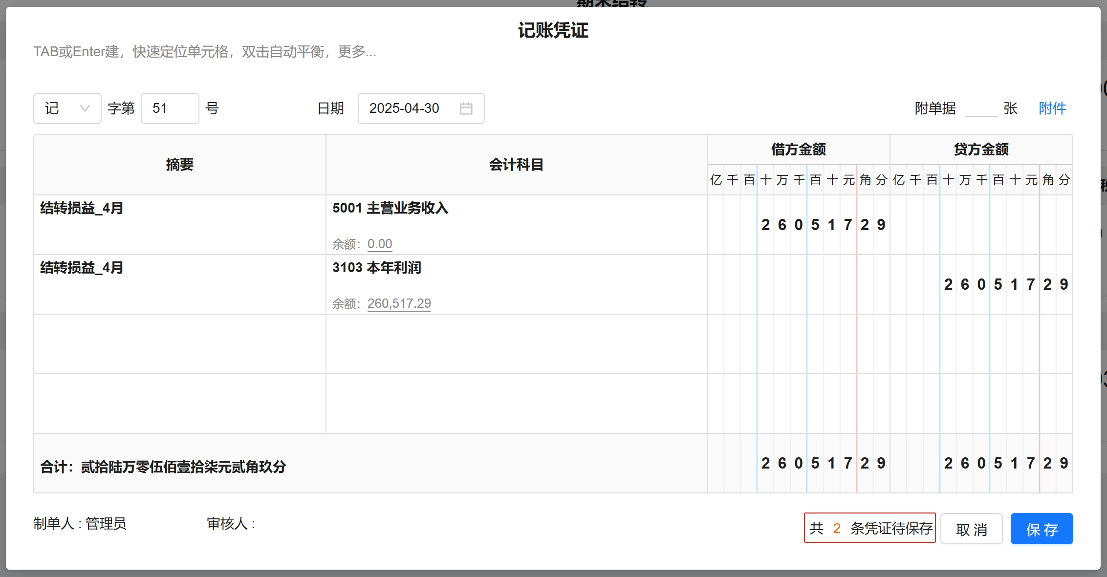 点击结转损益卡片上的新增凭证按钮,可以创建结转损益凭证,如果收入与费用分开结转,会创建2张凭证,如下图: