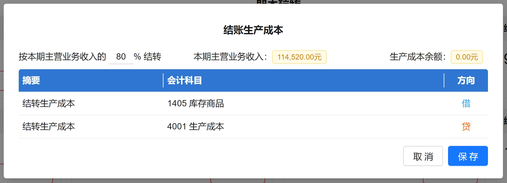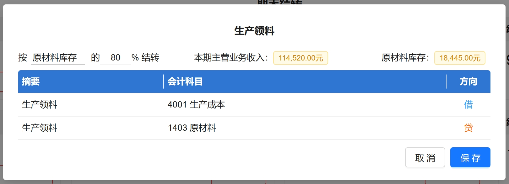 此卡片用于将从仓库领取的原材料结转到生产成本中,点击齿轮按钮弹出设置对话框,可设置按原材料库存或按主营业务收入的百分比进行结转,如下图: