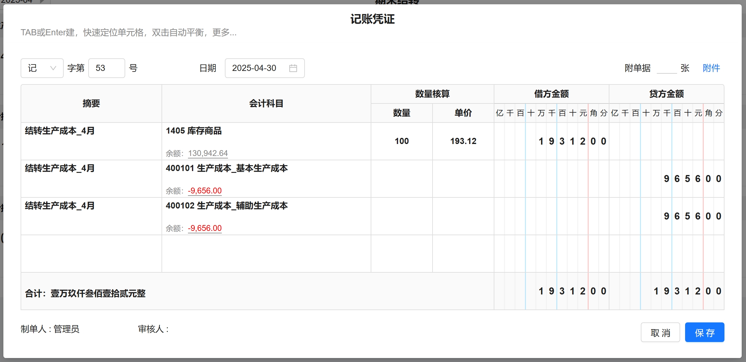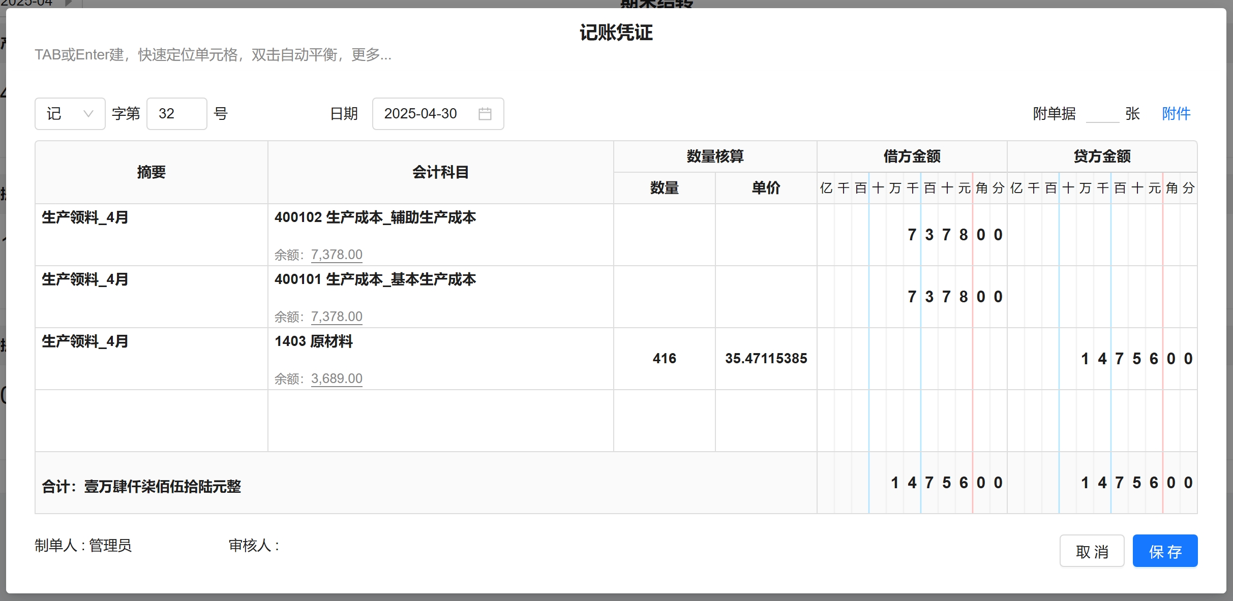 点击结账生产成本卡片上的新增凭证按钮,可以创建相应的记账凭证,如下图: