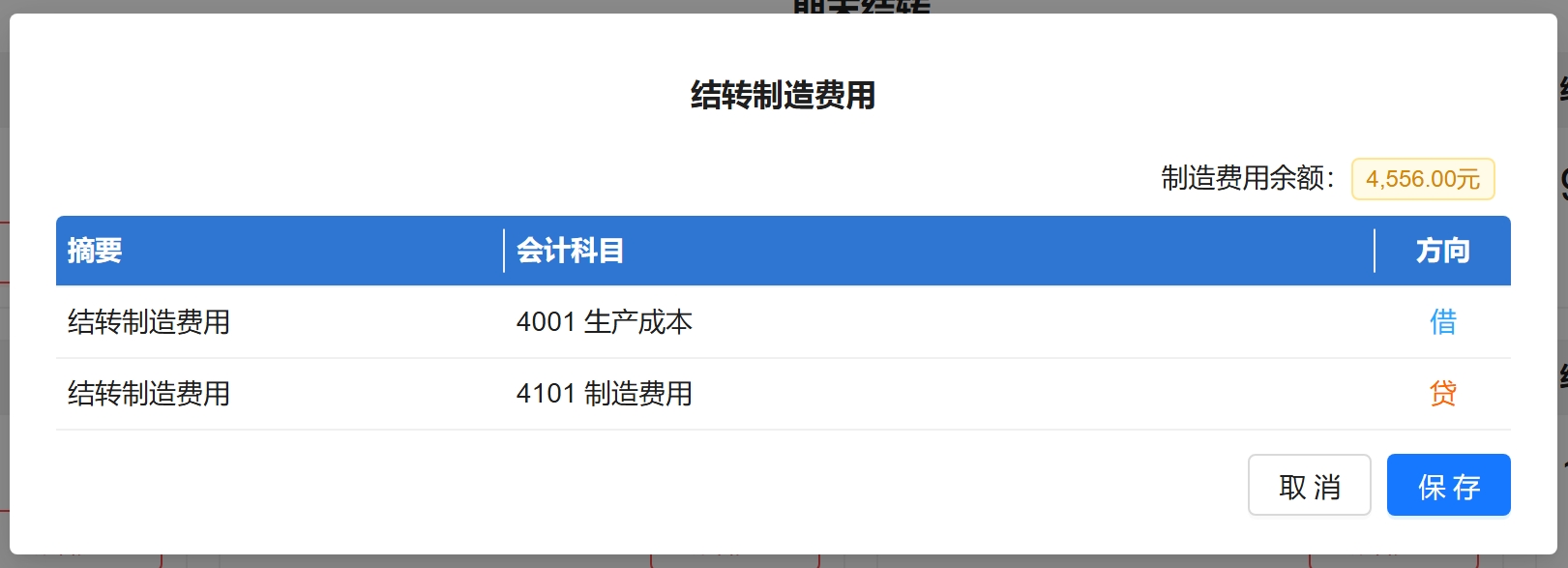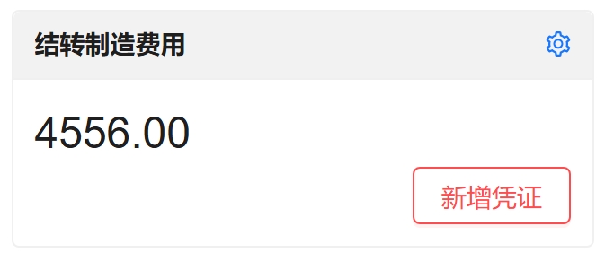 此卡片用于将制造费用结转到生产成本中,点击齿轮按钮弹出设置对话框,可查看目前制造费用余额,结转到生产成本金额不能大于制造费用余额,如下图: