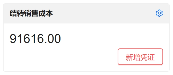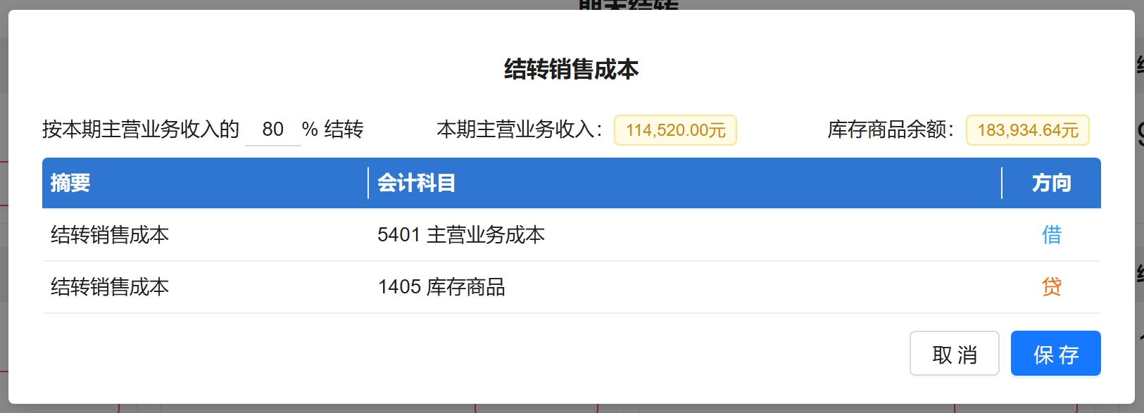 此卡片用于将已售库存商品结转到主营业务成本中,点击齿轮按钮弹出设置对话框,您可设置按主营业务收入的百分比进行结转,如下图: