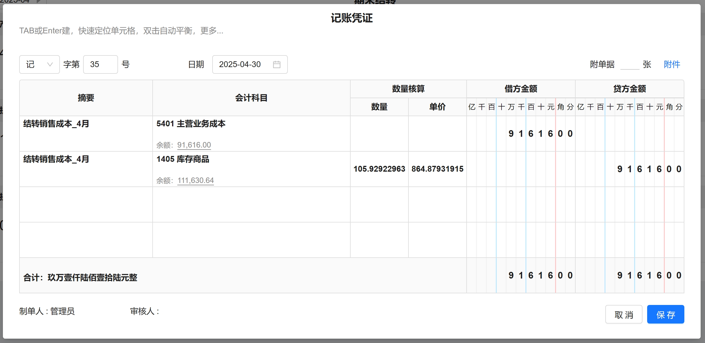点击结转销售成本卡片上的新增凭证按钮,可以创建相应的记账凭证,如下图: