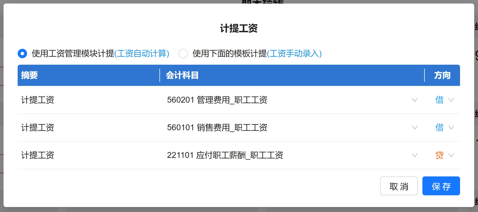 此卡片用于期末计提员工工资,点击齿轮按钮弹出设置对话框,您可设置使用工资管理模块(工资自行计算)或按工资卡片模板(工资手动录入)计提,如下图: