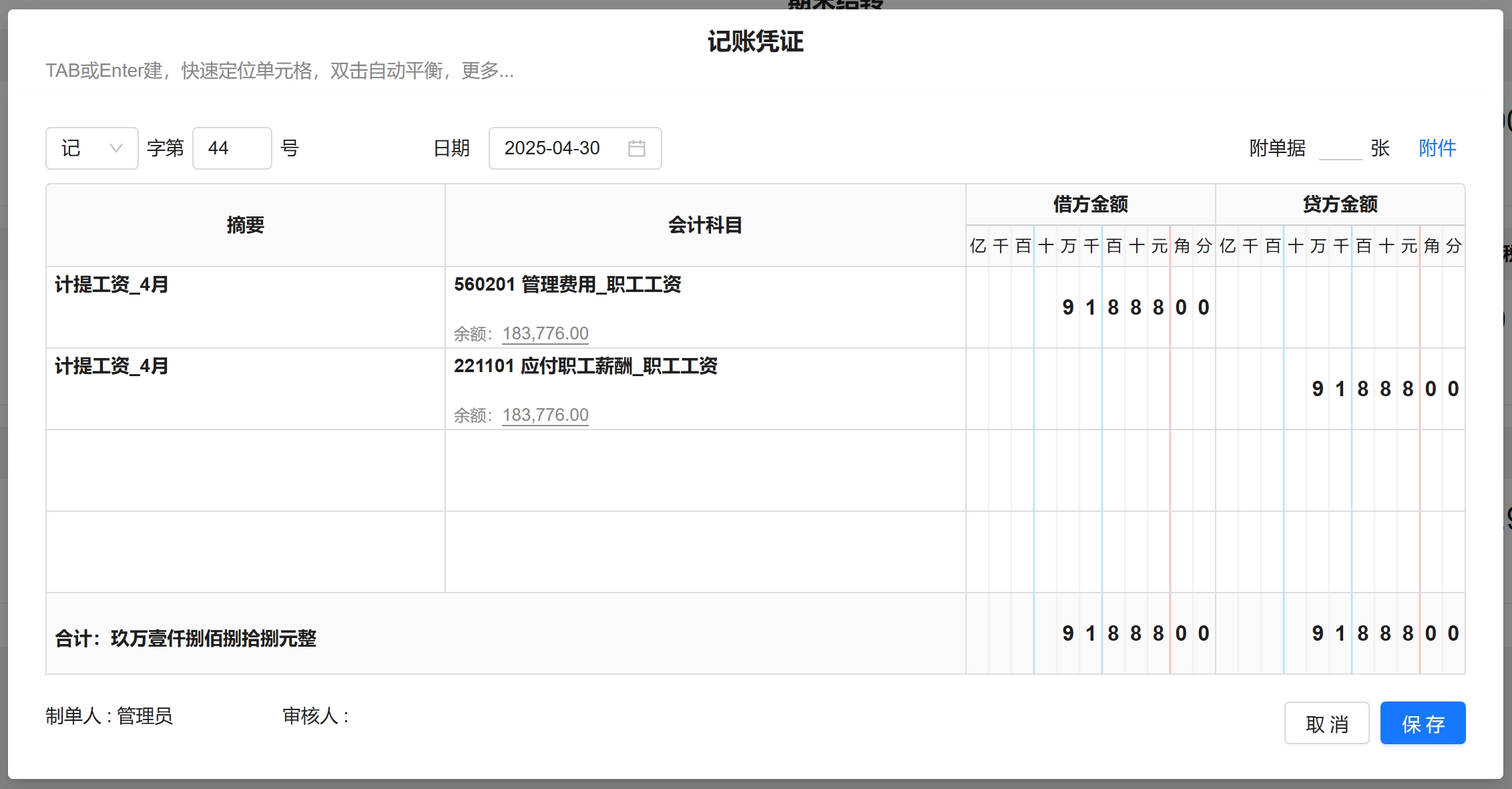 点击计提工资卡片上的新增凭证按钮,可以创建相应的记账凭证,如下图: