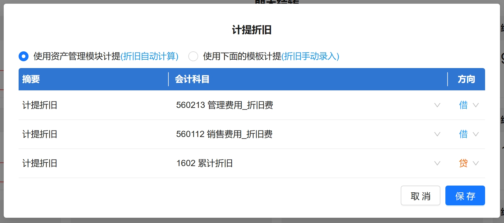 此卡片用于期末计提资产折旧,点击齿轮按钮弹出设置对话框,您可设置使用资产管理模块(折旧自行计算)或按折旧卡片模板(折旧手动录入)计提,如下图: