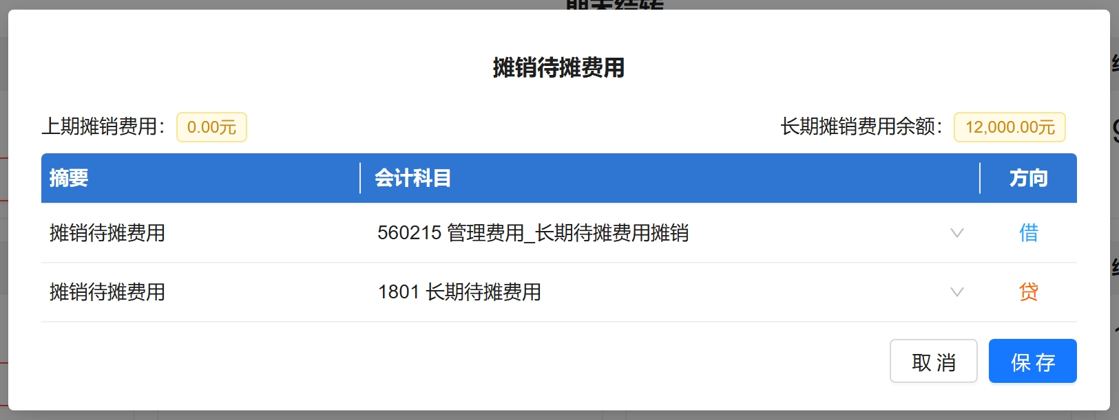 点击摊销待摊费用卡片上的新增凭证按钮,可以创建相应的记账凭证,如果是第一次摊销,摊销金额就是长期待摊费用余额(第一次摊销可能需要修改凭证余额),否则就是上期摊销金额,如下图: