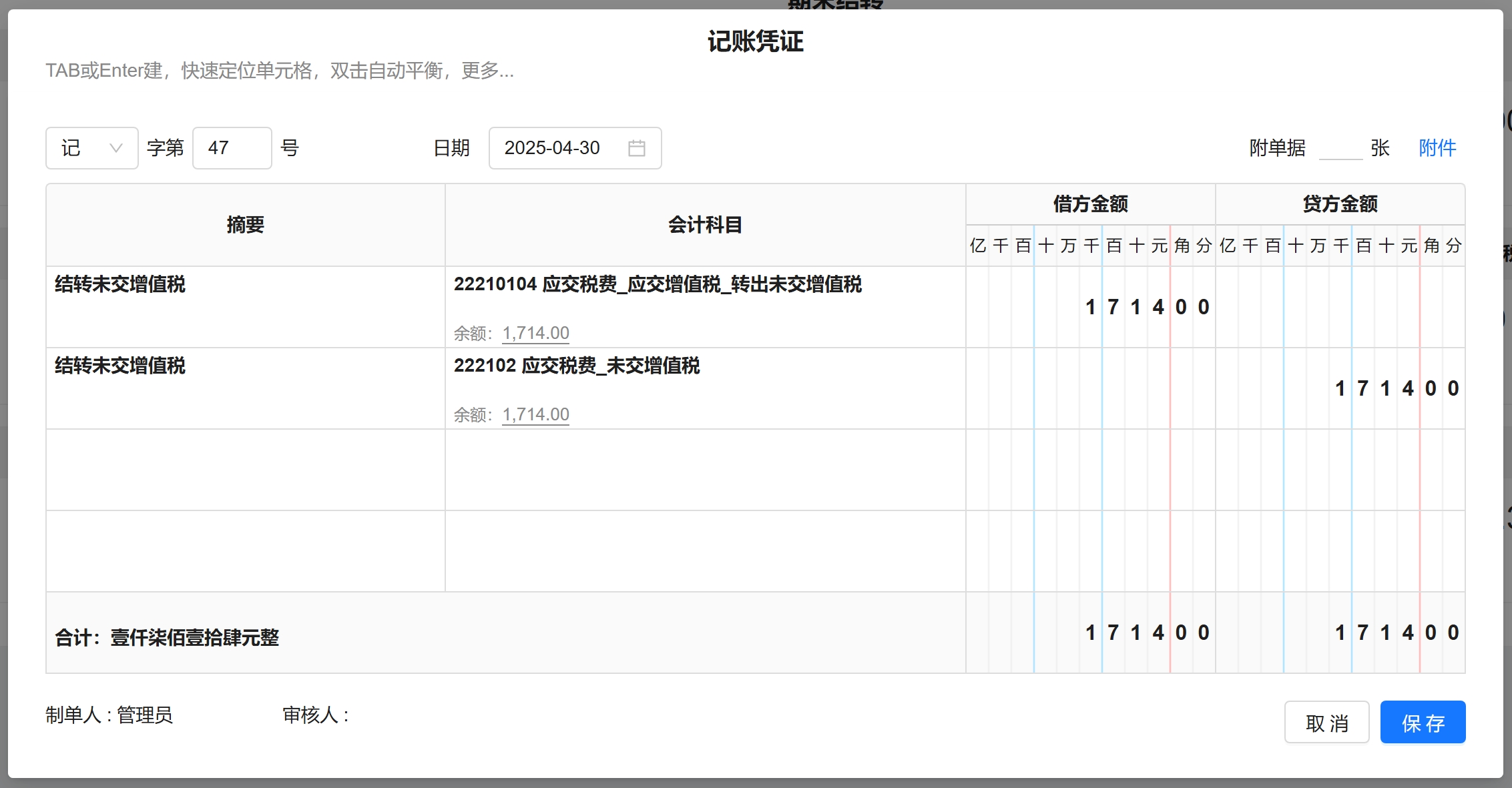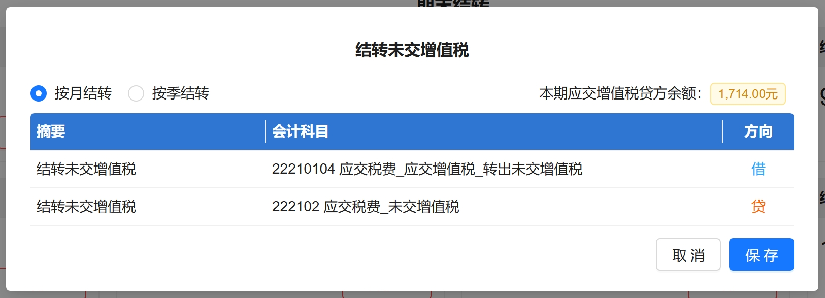 点击结转未交增值税卡片上的新增凭证按钮,可以创建相应的记账凭证,如果本期应交增值税贷方余额小于等于0时,无需结转,如下图: