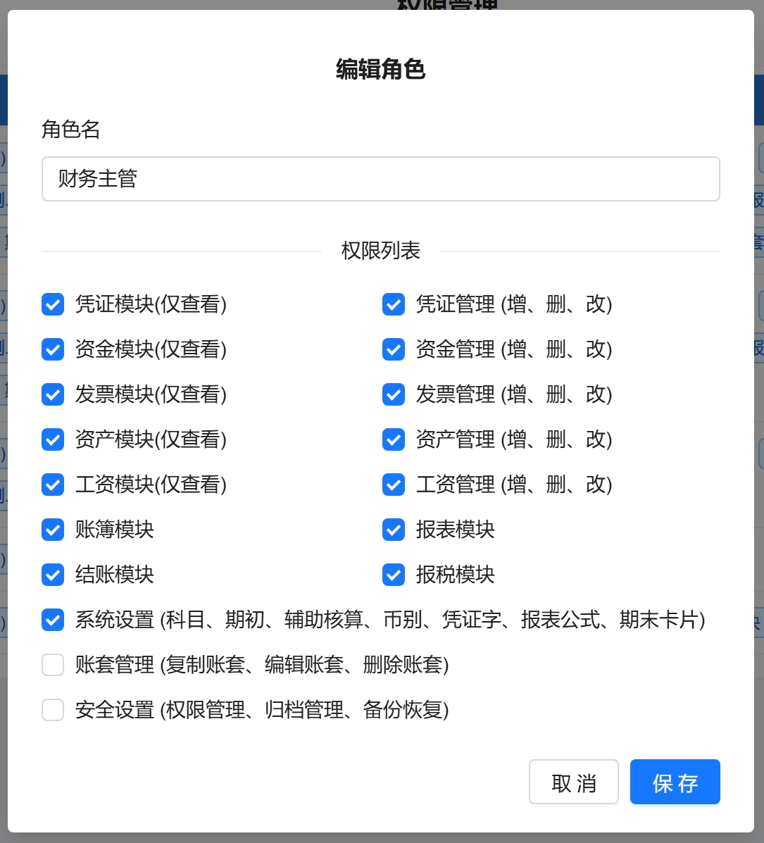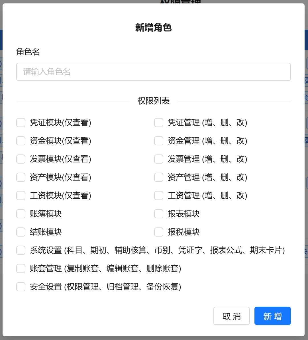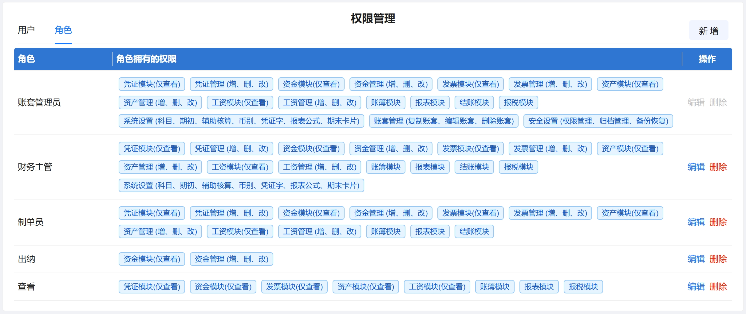 此界面用于账套角色的管理,包括新增角色、编辑角色、删除角色,如下图: