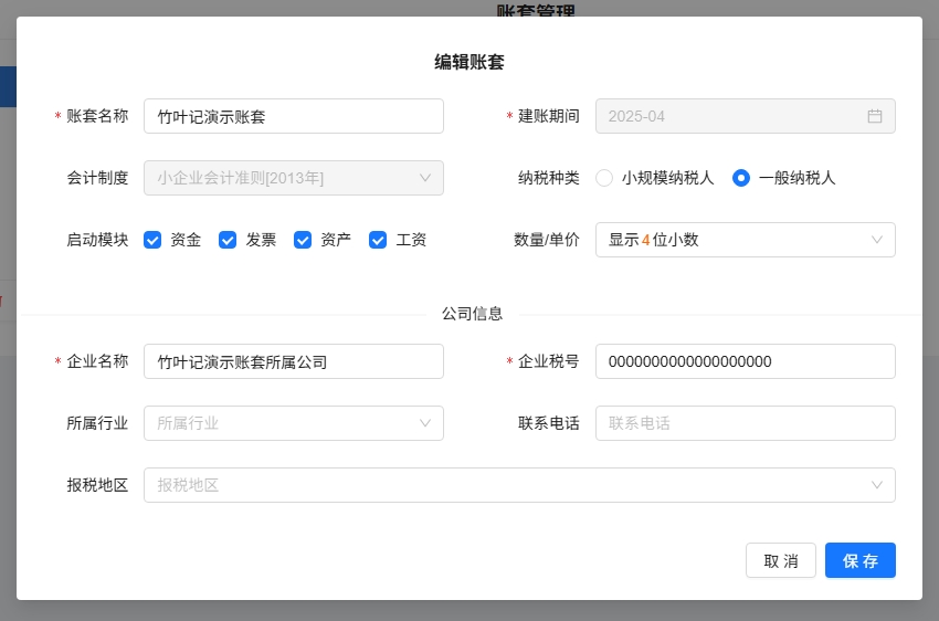 当您创建完账套,可在账套管理界面,点击编辑进行编辑账套,编辑账套界面和新增账套界面一直,如下图